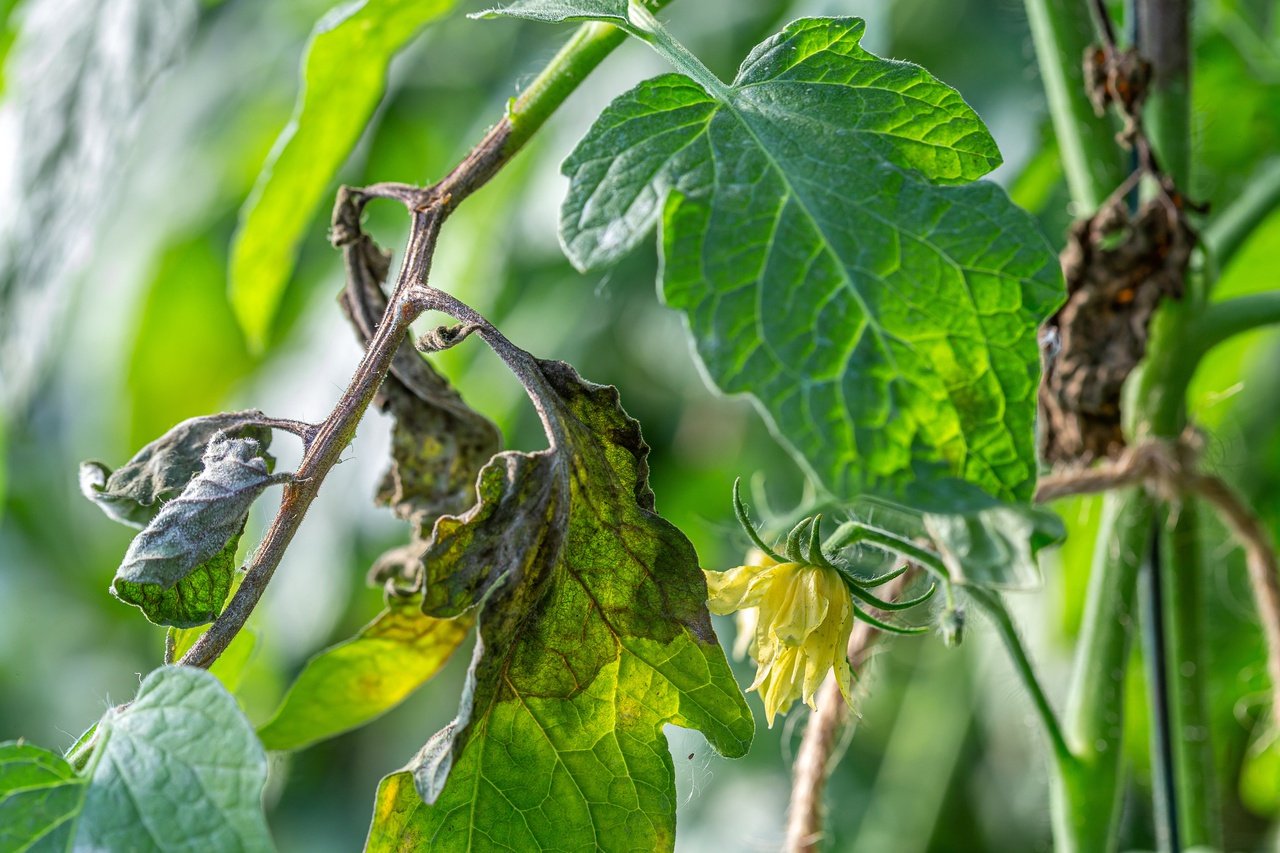 症状: 葉の裏に黄斑や灰色のカビ。進行すると葉が落ちる。